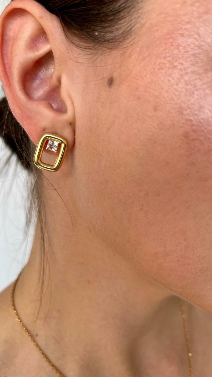 Confeccionado em prata 925, banhado no ouro amarelo 18k (15mm) e pedras naturais Topazio Branco com lapidação quadrada de 4mm e tarraxa grande banhada.